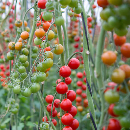 Bandejas de tomate cherry rama 100% ecológico. Esta variedad se caracteriza por su lenta maduración y su sabor dulce que te permitirá crear recetas sorprendentes.